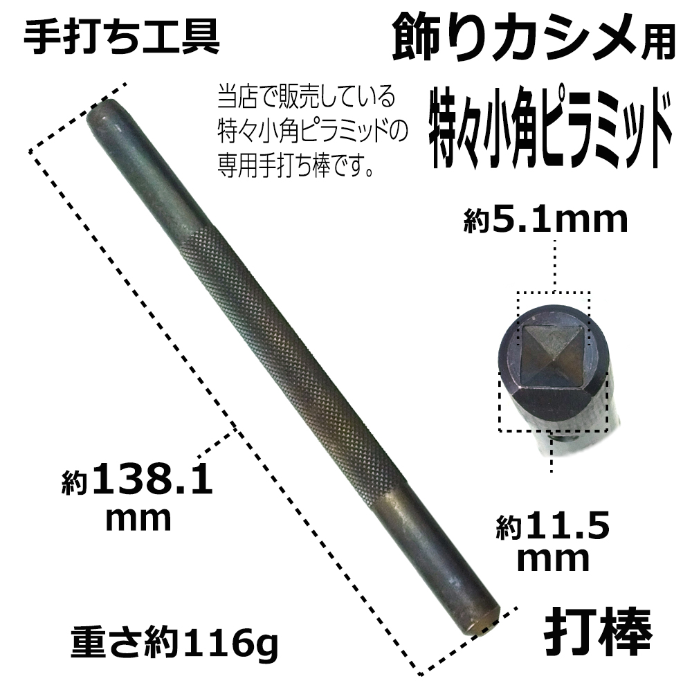 ミニ角ピラとも呼ばれる4mm辺の四角錐の頭をもった飾りカシメ「特々小角ピラミッド」を通常のカシメと同じようにカシメられる手打ち工具です。 この専用カシメ打ちは角ピラの頭の形状・傾斜に沿ってつくられています。